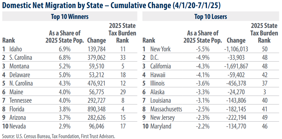 Many believed the migration patterns during COVID would reverse as people returned to work, but that has not happened. The data reveals a sustained trend towards states with lower taxes and lower cost of living. Analyzing Census data from April 1, 2020, through July 1, 2025, shows Idaho led the way gaining 6.9% in domestic net migration as a share of its state population over that period. On the flip side, New York faced a substantial loss, with a 5.5% decrease in domestic net migration as a share of its state population. In terms of sheer numbers, Florida emerged as the leader in net domestic migration, welcoming 890,348 individuals, while California witnessed the largest outflow, losing 1.692 million residents. The top 10 winners in domestic migration over this period displayed an average tax burden ranking of 15. Conversely, the top 10 losers in domestic migration exhibited an average tax burden ranking of 40.