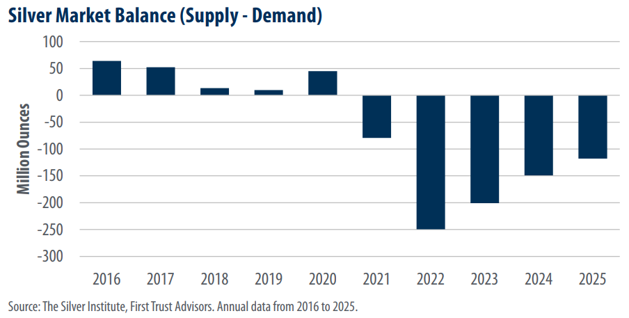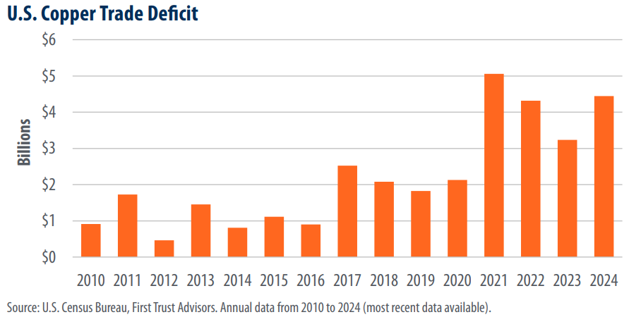While silver is used in advanced electronics, copper is more commonly used in industrial applications. About 42% of global copper demand is from construction, with another 23% tied to electronics and electrical equipment. As large-scale technology infrastructure projects (data centers and semiconductor fabrication plants) have accelerated in recent years, domestic copper consumption has climbed, pushing U.S. import needs higher and contributing to a widening trade deficit. In 2025, 57% of copper consumed in the U.S. was imported, up from 45% in 2024. That said, about 30% of the U.S. copper supply last year was recycled from scrap, providing some buffer to international supply chains.
