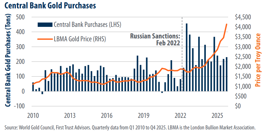 While often grouped together, gold, silver, and copper play unique roles in the economy: gold is the focus of national reserve strategy, silver supports both investment and electronics, and copper serves as the backbone of industrial and infrastructure expansion. In 2025, each of these forces was a defining feature of the economic landscape, helping to drive outsized returns in these metals over the year. Over the past month, all three have reached historic price milestones, reinforcing the importance of understanding what lies beneath the rally. In this week’s “Three on Thursday,” we examine the structural forces behind these moves. View the three charts below to explore what is driving the surge in precious metals and what it may signal about the broader economy.